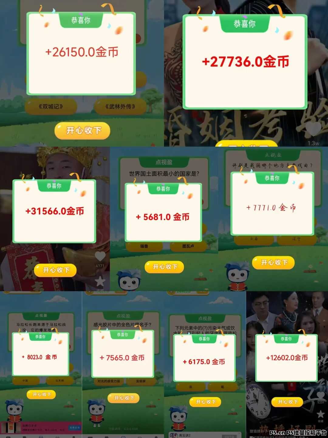 主打广告撸米,答题看广开包,一天最多36个视频 10000金币=1米,直接提到微信支付宝,一个号每个视频0.2~5米左右.